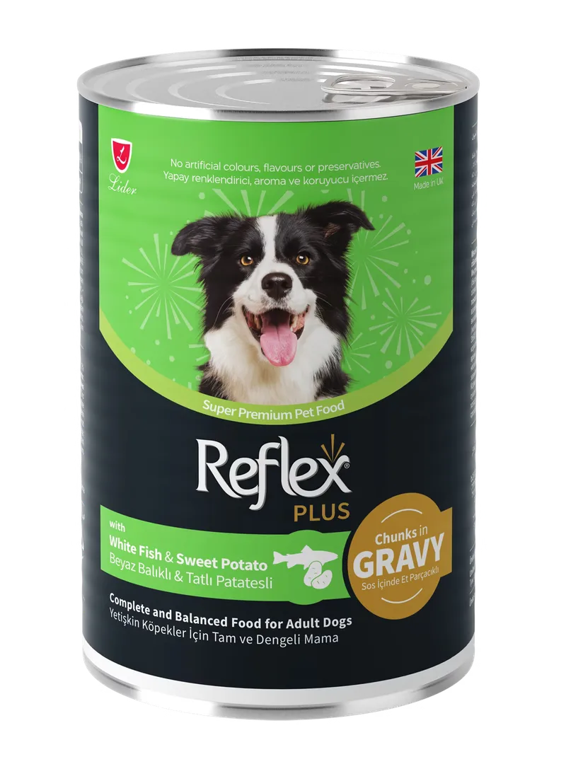 Reflex Plus Sos İçinde Et Parçacıklı Beyaz Balıklı ve Tatlı Patatesli Yetişkin Köpek Maması 400 Gr x 12 Adet